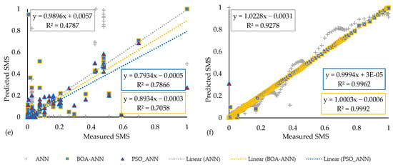 Soft computing and artificial intelligence techniques have been effectively emphasized in numerous science and engineering fields, particularly civil and geotechnical engineering [22,23,24,25]. Ann-based models have a wide variety of use in the prediction and forecasting of disasters by using time series data. Some previous articles considered a large-scale framework for daily hydrometeorological flow forecasting models in Canada [26], landslide risk assessment with PSO-ANN, grey wolf optimized based artificial neural network (GW-ANN), grey wolf optimized based random forest (GW-RF) [9], and river flood prediction using fuzzy neural networks [27]. The ANN approach has been successfully used to generate computational algorithms for various geophysical applications, including soil characteristics, weather and climate forecasting, remote sensing, and so on [28,29]. Predictive SMS models could be applied and employed in a wide range of sectors, including geotechnical engineering, agriculture, meteorology, and hydrology. Also, hybrid models could be used in transportation geotechnics to ensure the system is safe and better manage its conditions during extreme and unpredictable climatological events. A PSO can be considered one of the best candidates to optimize the ANN in geotechnical fields and specifically for predicting clay matrices [30,31]. Furthermore, when used as part of the asset management implementation process, the ANN-based model can considerably reduce the issues associated with the repair, maintenance, and renewal programs in the event of future extreme events. The use of predictive models will make some fundamental concerns clearer, particularly in geotechnical engineering applications. For example, knowing what SMS variations are likely to occur will contribute to the design of climate-adaptive transportation infrastructure, saving money and time.