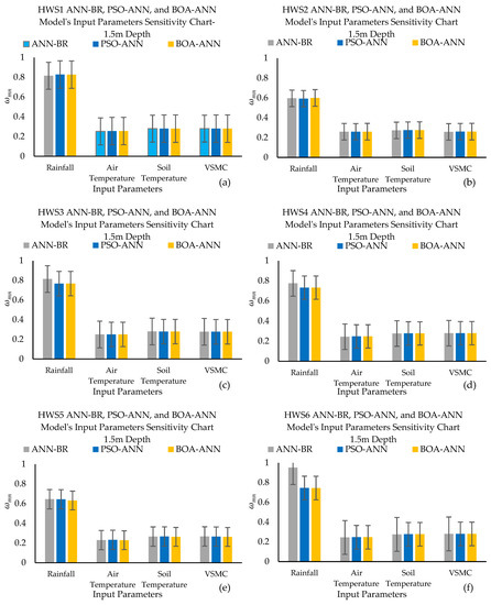 Levels of 1.5 m, 3 m, and 4.5 m depths for an 18-month from September 2018 to March 2020 monitoring interval in six HWS at Jackson Metropolitan, Mississippi, were used for the research investigation. Moreover, the rain gauge, data recorder, and connector for the moisture sensor were located toward the top of the slope for continuous monitoring for each site. The 1.5 m, 3 m, and 4.5 m depth sensors were programmed with hourly data. Air temperature, soil temperature, rainfall, VSMC, and SMS data were gathered every two weeks for data processing. Therefore, for the above time frame, 13,690 hourly data were received from each sensor mentioned in Figure 3. Hence, 13,690 related data points were created as separate time-series datasets for each input and one output variable. The layout, the installing levels of sensors that were repeated for each six HWS, and the sensors’ models are shown in Figure 3. Because this research considered six HWS, sensors were installed on the top (1.5 m), middle (3 m), and toe (4.5 m) of each HWS; in total, 18 data sets were made; and each one had 13,690 hourly time series data.