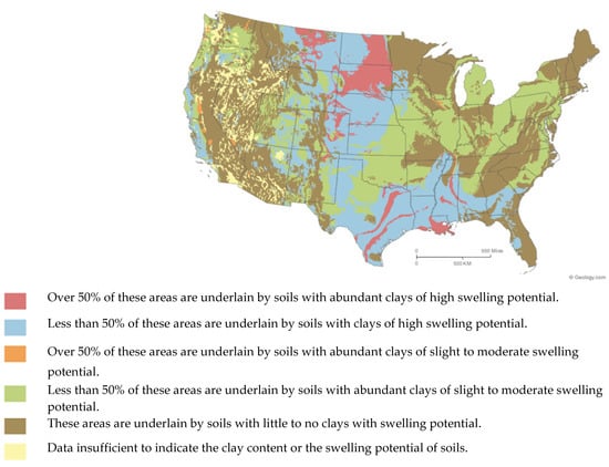 - Olive, W.; Chleborad, A.; Frahme, C.; Schlocker, J.; Schneider, R.; Schuster, R. Swelling Clays Map of the Conterminous United States; United States Geological Survey: Reston, VA, USA, 1989.