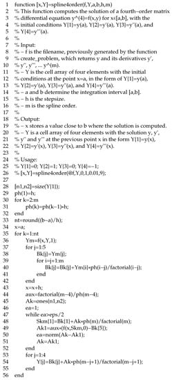 Figure 1 lists the MATLAB code for approximately computing the solution matrices , , , and of the fourth-order ordinary differential equation given in Equation (4). This code uses the cell-array data type for storing sets of matrices. In line 36, the values for , are obtained and stored in the cell-array variable Ym by invoking the f MATLAB function to return the matrices which appear in the expressions given by Equations (24)–(28). In lines 37–42, the expressions , , , , and from Equations (24)–(28) are computed. In lines 45–52, the matrix is worked out by using fixed-point iteration. Finally, in lines 53–55, the matrices , , , and are computed.