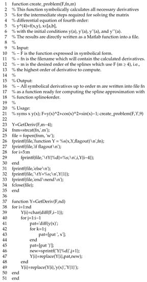 Figure 2 reproduces the MATLAB code of the function create_problem, which automatically generates an output file, such as the one shown in Figure 3, containing all symbolical derivatives required for the main program, viz. Figure 1. The symbolical results in this file are then readily accessible as a function for computing the spline approximation with function spline4order. Note that for the computer algebra, the MATLAB interface to MuPAD is called [21,22]. All the essential codes, including future developments, will be made available for public use [23].
