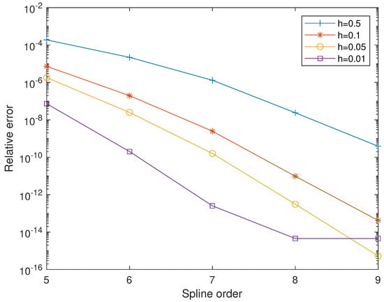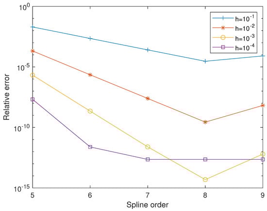 Relative errors for the problem given in Equation (31), for several spline orders (). We discretely vary the value for , and 5, with a fixed stepsize .