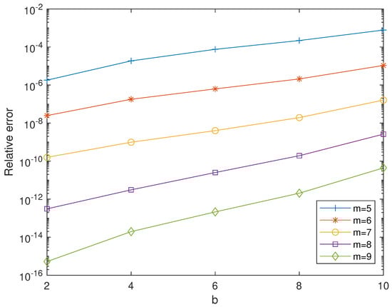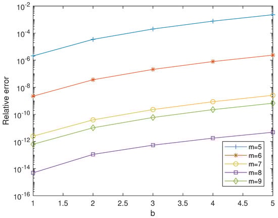 The five graphics of Figure 8 correspond to the relative errors for the spline orders , , , and , varying the final points (), for a fixed stepsize . As can be seen, the error increases when the value of b grows. Similarly, the error drops as we decrease the stepsize. The most accurate results are obtained when .