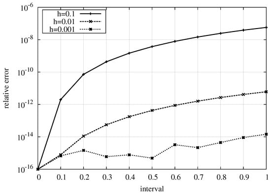 Relative errors for the matrix problem given in Equation (36), with seventh-order splines () and various stepsizes (, and ).