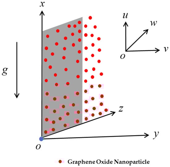 Consider a mixed convection boundary layer stagnation-point flow of a linear three-dimensional nanofluid induced by a vertical plate located along the -plane, as depicted in Figure 1. The background of the physical model can be bounded with the help of Cartesian coordinates , , and , and the flow enactment occupies the domain . Additionally, in this flow model, we considered that the density varies linearly along with the temperature; hence, Rosseland’s linear thermal radiation was assimilated to analyze the heat transfer behavior. In this examination of the coordinate system, the velocity at the plate was assumed to be zero, while the velocity of the far field or free stream is signified by the components , , and , where and are arbitrary constants. Moreover, the nature of the stagnation point (SP) is determined by the signs and relative magnitudes of and . If the normal component of the mainstream velocity is oriented toward the wall surface of the plate—that is, if —we speak about a point of attachment in this study. A point of separation is used in the opposite situation. The stagnation point is called a nodal point if and have the same sign; otherwise, it is called a saddle point. Furthermore, the variable temperature at the plate and the far-field constant temperature are denoted and , respectively. For the heated plate (buoyancy-assisting flow), the temperature at the plate is greater than the requisite far-field temperature—i.e., —while the case in which represents the cooling plate (buoyancy-opposing flow). For thermal enhancement, graphene oxide (GO) was incorporated into the base fluid (water) to form the posited nanofluid.