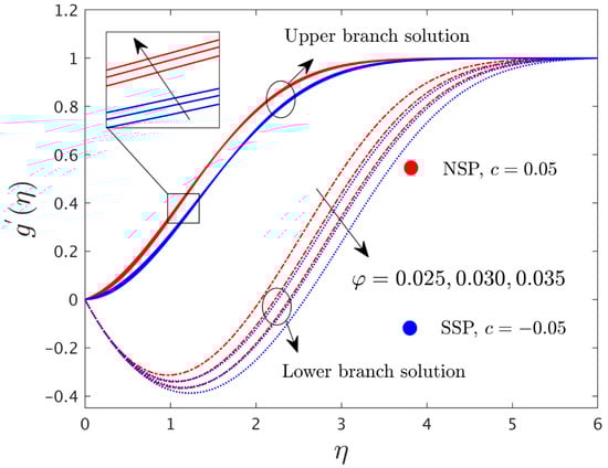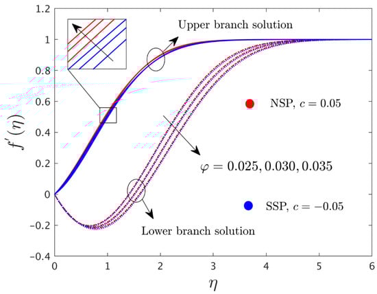 The impact of the nanoparticle volume fractions on the field of the velocities and in the respective x- and y-axis coordinates for the UB and LB results are shown in Figure 2 and Figure 3, respectively. In both the graphs, the outcomes were calculated for the SSP () and the NSP (). The consequences indicated that the augmented values of suggested an amplification in the field of the velocities and in the corresponding x- and y-axis coordinates for the UBS, while, for the LBS, the field was decelerated. In addition, the gap between the curves of the UBS for both the NSP and SSP was much smaller compared to the curves of the LBS. After observing the graphs in more detail, the outcome magnitudes of the velocity profiles along both axes of direction, as well as the momentum boundary layer thickness for the case of the NSP, were slightly higher and looked better than the outcomes for the SSP when we increased the influences of the nanoparticle volume fractions.