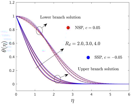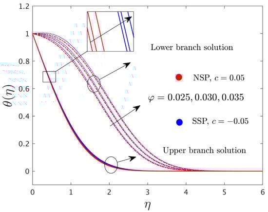 Figure 4 and Figure 5 demonstrate the influences of and the radiation parameter on the temperature distribution in relation to the pseudo-similarity variable for the UBS and LBS, respectively. The outcomes in both the plots highlighted the fact that, for the SSP, , and for the NSP, . From the graphs, it was observed that the temperature distribution profile increased for both the NSP as well as the SSP when we boosted the values of and . Further, it was seen that the solution for the temperature profiles behaved monotonically and increased for the UBS and LBS due to the significant impact of and . Physically, the nanoparticles and the radiation parameter showed direct proportionality with the distributions of the temperature curves. The significant roles of and demonstrated well-known thermal conductivity behavior; therefore, the thickness of the thermal boundary layer and the shapes of the temperature for the UBS and LBS were enriched. In addition, the gap between the curves of the UBS was slightly better than for the LBS. Moreover, the temperature curves looked more advanced for the SSP relative to the NSP.