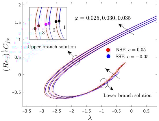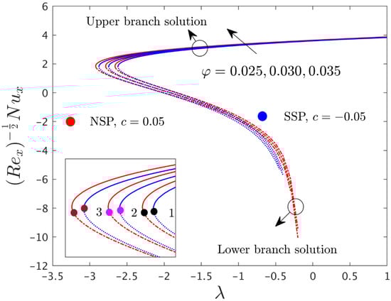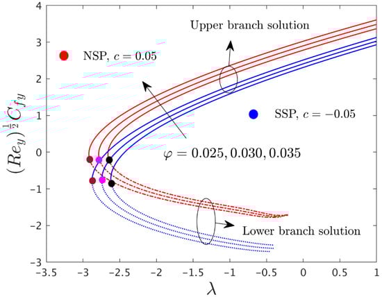 Figure 6, Figure 7 and Figure 8 exemplify the influence of on the shear stress in the respective x-axis and y-axis coordinate directions and the rate of heat transfer for the SSP and the NSP, respectively. In both the plots, we constructed the outcomes for the UB and the LB. From the outcomes, it can be seen that the drag force in both directions, along with the heat transfer, escalated for the UBS owing to the larger values of , and the speed slowed down in the LBS when was increased. In these graphs, the UB and LB results were generated for a certain range of the buoyancy or mixed convection parameter (λ). The outcome was unique for the case where λ = λC, no solution was possible for λ < λC, and a unique solution was accomplished for the case where λ > λC. Further, it was detected from the plots that multiple (UB and LB) outcomes were possible for , , and for −2.66120, −2.78750, −2.92105, −2.62140, −2.74570, and −2.87770, respectively. The first three critical values (−2.66120, −2.78750, and −2.92105) were found for the case of the NSP with varying , while the other three values (−2.62140, −2.74570, and −2.87770) were presented for the case of the SSP. Furthermore, this highlighted the fact that the critical point of the boundary layer only appeared in the buoyancy-opposing flow. Moreover, the magnitude of the bifurcation values became larger with the intensification of . This pattern suggested that the SBL shrank with greater influences from the nanoparticle volume fraction.