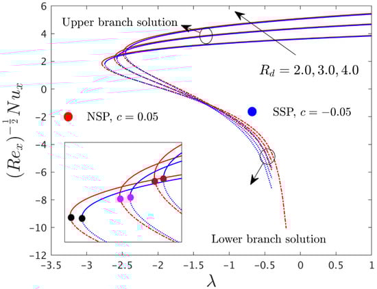 Next, we investigated the influence of the various parameters on the velocity profiles and , the drag forces in boththe x-axis and y-axis, and the rate of heat transport for the UBS and the LBS, as shown in Figure 2, Figure 3, Figure 4, Figure 5, Figure 6, Figure 7, Figure 8, Figure 9 and Figure 10. These graphs were mainly discussed and calculated for the cases of the SSP () and the NSP (). Buoyancy-assisting flow (BAF, λ > 0) and buoyancy-opposing flow (BOF, λ < 0) were also considered in this examination. The multiple solutions (UB and LB) were only developed for the BOF situation, while we developed a single-branch solution for the BAF situation. For the numerical simulations, the fixed default values of the suggested parameters were the following: λ = −2.0, , , , and . In addition, all the graphs show the outcomes of the UBS and LBS, and the UBS is signified by the hard or solid lines and the LBS is indicated by the dashed lines. Furthermore, red, blue solid, and dashed lines indicate the NSP and SSP, respectively.