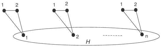 Barrire et al. [21] brought in a generalized hierarchical product that is a continuation of the (standard) hierarchical and Cartesian product [22]. Let and be graphs with , where . Then, the generalized hierarchical product is a graph with vertex set and if and or and . For , where , a path among vertices through is an -path in consisting of some vertex ( or ). The distance among h and g through , symbolized by , is the length of a minimum path among h and g through . It is easy to see that if and , then . For more details, see [23]. The upcoming important lemma gives some properties of .