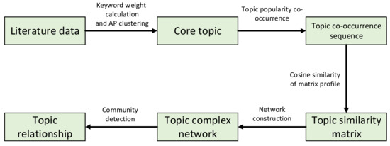 To address the lack of deep-seated relationships within and between topics in traditional research, based on the importance of keywords and the core topics obtained by AP clustering, the co-existence sequences between the two topics are calculated. Each co-existence sequence is divided into sequence segments according to sliding windows by matrix profile. The similarity between all subsequences is calculated by cosine similarity measure to search for the most similar subsequences corresponding to each subsequence. The number of subsequences that are most similar between each topic sequence is counted, which is the similarity values between the two topics, and a similarity matrix is obtained. According to the similarity matrix, the network is constructed. The topic is the vertex of the network, and the two topics with the most similar subsequence segments are connected. Through community detection, the topic network is divided. The closely related topics are divided into a community, indicating that the topics in the same community are strongly correlated, and the topics in different communities are weakly correlated or uncorrelated, resulting in the “high cohesion and weak coupling” effect of topic division. The specific research framework is as shown in Figure 1.