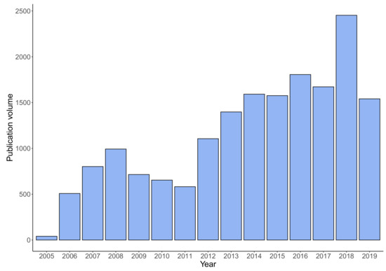 In Figure 2, the number of literature published in 2005 was the least (41), and the number of literature published in 2018 is the highest (2453). Meanwhile, the number of literature during the six years from 2005 to 2011 is relatively low, the main reason is that the database maintains the integrity of the literature of the past 10 years, and regularly cleans up the literature more than 10 years. Over time, the literature of more than 10 years is gradually deleted from the database. To avoid the unbalanced impact of the annual literature collection, the annual literature data was standardized.