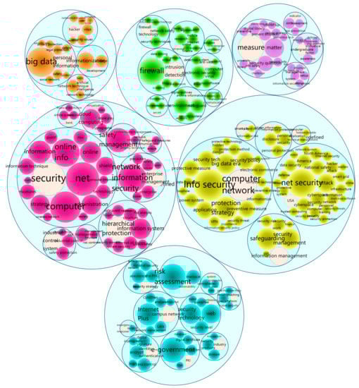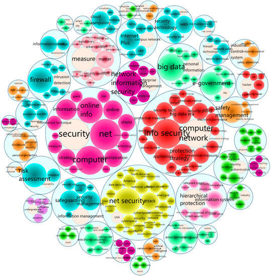 In Figure 3, each circle with a border represents a cluster (class or topic), while the largest borderless circle in the cluster represents the keyword with the greatest attention in the cluster, and the circle with a different color from that in the cluster represents the center representative object of the cluster. For instance, in the cluster where “info security” is the most concerned, “computer network” is the cluster center, which better summarizes the topics expressed by other cluster members, that is, the related research with “computer network” as the topic usually includes the research of “info security”, “protection strategy” and “big data era”.