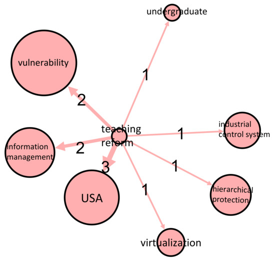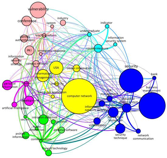 In Figure 7, 42 topics are contained. Each topic is represented by a circle. The identifier on each circle is the topic name. The size of the circle indicates the frequency of the topic in 2005–2019. The more the number of occurrences, the larger the circle. The color of circles represents the clustering results of topics. Circles with the same color belong to the same cluster. The edge between circles represents the correlation between the connected two topics. The thicker the edge, the more relevant the two topics. According to the community division, 42 topics are divided into 6 clusters. The topics within and between clusters are connected, and the topics within clusters are more closely connected. Each of the 6 clusters has a relatively central topic, namely “teaching reform”, “hacker”, “communication”, “industrial control system”, “USA” and “measure”, which have a broader meaning. Due to the greater likelihood of co-occurrence with many topics in the literature, topics with a wide range of meanings are more likely to become central links between topics. Therefore, when obtaining literature in related fields, users can search for topics in the form of “specific keywords + fuzzy keywords”, so that the obtained literature topics are more accurate and the results are more in line with the research needs. Besides, in Figure 8, the frequency of topics with central connections are usually not high. The reason is that such topics have a wide range of concepts. In the compilation process of actual literature, words with wider meaning are less used as keywords, and the content of literature is generally specific. However, since fuzzy retrieval is easier to query results [30], topics with broader concepts are likely to appear alongside other topics.