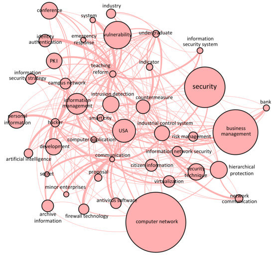 Through literature research approach [5], 278 high-frequency keywords were clustered [16], and 42 topics such as “security”, “intrusion detection”, “enterprise management” and “hierarchical protection” were obtained. The topic clustering results are shown in Figure 3.