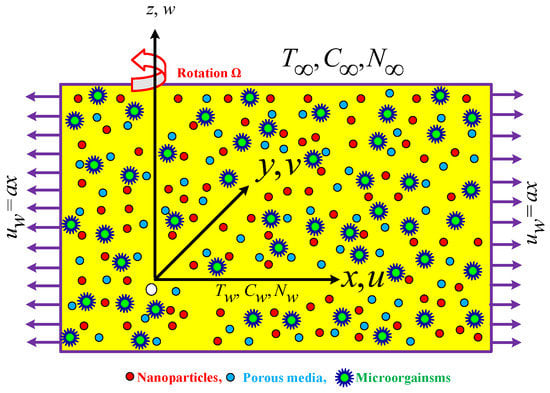 The objective of this study was to observe the significance of the Coriolis force on the dynamics of Carreau–Yasuda rotating nanofluid subject to Darcy–Forchheimer. The energized particle’s thermal movement generates no electromagnetic radiation in fluid due to the radiation effect’s unavailability. The impact of bioconvection was explored. Further, the nanoparticles were incorporated due to their unusual characteristics (e.g., extraordinary thermal conductivity), which are significant in heat exchangers and advanced nanotechnology. The surface corresponds with the stretching plan z ≥ 0 and = k, here, k is the unit vector along the z-axis, as shown in Figure 1. This figure depicts the geometry of this research problem. The Cartesian coordinate system, along with the z-axis angular velocity, existed on the rotating framework. The main objective of this study involved the enhancement of heat transportation. The agglomeration of tiny particles was ignored; the nanoparticle suspension was assumed to be a stable compound, which is very important for the presence of motile microorganisms. Furthermore, we suppose that perhaps surface concentration and warmth as well as the environmental concentration and temperature are , , and , , respectively. The governing equations of the problem are presented below [35,36,37,38].