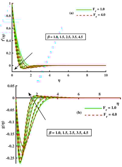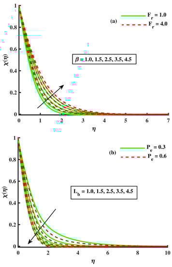 Figure 6b and Figure 7b show the implication of the Buongiorno model parameters, such as thermophoresis and the Brownian motion on the temperature field. In these figures, we noticed that the base fluid temperature was enhanced against higher input of & , but the concentration field showed similar behavior against and declined against . Similar curves for the temperature and concentration field against Buongiorno’s model parameters have been reported by many other researchers, and physically, the nanoparticle movement occurred due to the thermophoresis force, which caused nanoparticle movement from the hot region to the cooler region, and that is why heat transportation was faster at the boundary region. Similarly, the tiny particle random motion was faster in the base fluid, which elevated the Brownian motion to strengthen the thermal transport [7,8]. Figure 10a,b demonstrates the decreasing motile microorganism function against the input of higher value & . According to Ali et al. [29], the physical reason behind this trend is explained as follows: the bioconvection Lewis number and Péclet number are declining functions. In fact, the Péclet number is the proportion of the extreme cell swimming speed to the diffusivity of microorganisms as the escalation in raises the speed of motile microorganisms, shrinking the motile density.