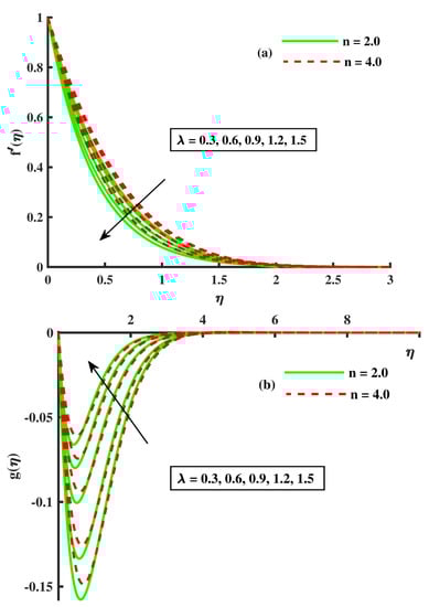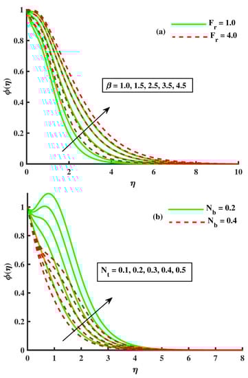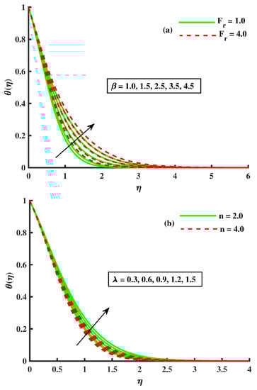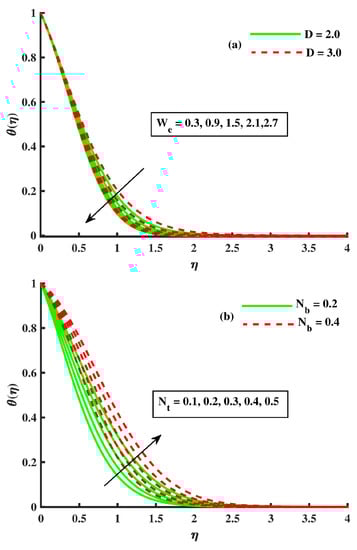 In Figure 5a,b and Figure 6a,b, we describe the effects on the temperature by changing parameters. In these figures, we noticed that the base fluid temperature was enhanced against higher inputs of , but declined against n & . Physically, the nanoparticle movement occurred due to the thermophoresis force, which caused nanoparticle movement from the hot region to the cooler region, which is why heat transportation was faster at the boundary region. Similarly, the tiny particle random motion was faster in the base fluid, which elevated the Brownian motion to strengthen the thermal transport. The rise in enhanced the elastic forces that were more prominent as compared to viscous forces, which declined the fluid temperature . Similarly, the drag force was produced due to the porous medium, which resulted in thermal dissipation to create extra heat.