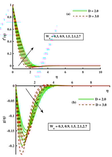The rotating () and Forchheimer number parameter impacts on the velocities are described in Figure 2a,b. When there was an increase in the rotational parameter , a decrease occurred in the velocity distribution along ‘a axis’, but an inverse trend was reported along the y-axis. Physically, the stretching rate of the sheet decreased as increased; hence, the velocity decreased. In Figure 2a,b, regarding the consequences, one can observe how the change in the parameter took place by the variation of velocities & ). When one can increase, reduces the magnitude of the fluid flow, thus reducing the speed. Regarding the association with the porous medium, which makes the fluid more viscous and produces an opposition, this force is responsible for slowing down the fluid speed. A similar influence in Figure 3a,b against the higher strength of the porous parameter is noted; we observed that the impacts of on () were comparable to those of . When increased, the viscosity of fluid was elevated, creating resistance to the flow and reducing the speed of the flow. Further, the growing value of n elevated the primary ), but an opposite curve behavior was also noted. Figure 4a,b presents the physical description of (Weissenberg number) and D (Carreau–Yasuda constant) on the dynamics of & ). The booted up against ; decreasing curves were reported against D, and ) showed an opposite trend. The rise in enhanced the elastic forces that were more prominent as compared to the viscous forces that boosted the fluid velocity. Further, slowed down when growing the strength of D, and an inverse curve trend in ) was observed.