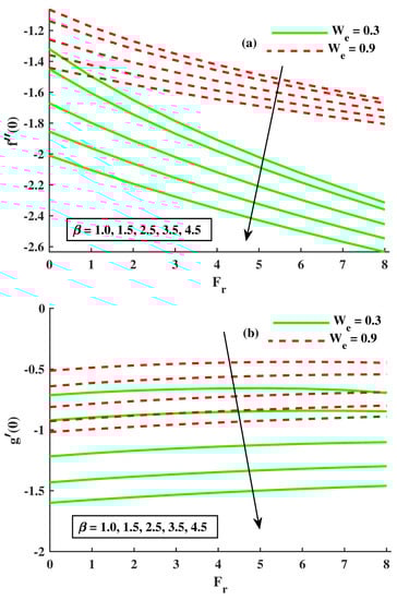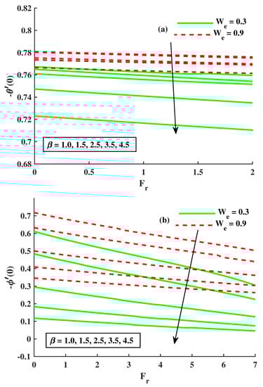 Figure 2a,b demonstrates the influence of the rotating () and Forchheimer number against the growing strength of these involved parameters. The magnitudes of both velocities decreased via rising values of . According to Bagh et al. [45] and Tayyab et al. [39], the physical reason behind this behavior is the Coriolis force and incorporated, respectively, in Equations (9) and (10). As mentioned above, velocity g is negative, the two forces in their respective orders impart opposing impacts on . Further, the association with the porous medium, which makes the fluid more viscous, produced an opposition; this force was responsible for slowing down the fluid speed. An opposite trend was reported in the temperature and concentration distribution against rotating and the Forchheimer number (see Figure 5, Figure 6 and Figure 7a). The viscosity of the fluid elevated against the higher input of porosity, which created resistance to the flow; this resistance force slowed down the fluid velocity, which enhanced the temperature [26]. Figure 4a,b shows the variation of velocities against rinsing values of , and the magnitudes of both the velocities boosted against . According to Rana et al. [36] and Tayebi et al. [32], the reason for the outcomes are elastic forces, which were produced due to the growing strength of the Weissenberg number. The rise in enhanced the elastic forces that were more prominent as compared to viscous forces, which boosted the fluid velocity. Further, the profile shows a decline against (see Figure 6a).
