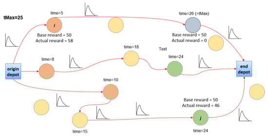 Regarding position-dependent versions of the TOP, Reyes-Rubiano et al. [23] proposed a biased-randomized learnheuristic for solving the TOP with position-dependent rewards. In their work, rewards associated with each node were given by unknown (black-box) functions, the values of which were estimated based on existing observations and using learning mechanisms. Bayliss et al. [3] discussed a TOP for modeling the coordination of drones with aerial motion constraints. In this case, travel times were path-dependent, and a learnheuristic approach was proposed to deal with the complexity associated with the position-dependent components of the problem. Other time-dependent TOPs, also including time windows, have been discussed in Gavalas et al. [24] and Yu et al. [25]. To the best of our knowledge, however, no previous studies have considered both a position-dependent and stochastic version of the TOP, like the one discussed in this paper.