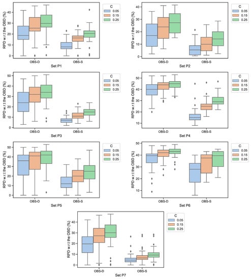 The obtained results showed that the OBS-S solutions provided by our simheuristic approach clearly outperformed the solutions for the deterministic version of the problem when these were tested in a scenario of uncertainty (OBS-D). On average, an improvement close to 13% was observed for OBS-S with respect to OBS-D. In order to assess our simheuristic in different stochastic scenarios, Figure 2 summarizes the average RPD of OBS-S with respect to the OBS-D obtained using different variance levels. Note that, for all sets, the OBS-S box-plot is always closer to the OBS-D value than the OBS-D box-plot. In the case of set , which contained the larger and more challenging instances, our simheuristic approach providing an average RPD close to %, which can be contrasted with the % reported for OBS-D. This confirms that the deterministic solutions performed optimally only when all the elements of the problem were deterministic, but they could easily become sub-optimal when used in scenarios under uncertainty.