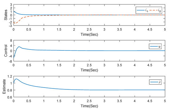 In the derivation process, there is a complex term , which is produced inevitably (see (5) and (11)). Because is unknown, it is difficult to deal with this term directly. To solve this problem, we first estimate with and replace the resulting ρ with (see (19) and (34)). Then, we combine the terms with to design , which can be found in (6), (22) and (42). Finally, the adaptive law (42) is derived. This is one of the main innovations of this paper.