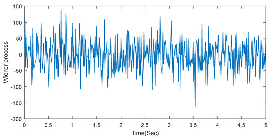 We select the parameters , and the initial values of the system states of (53) are . In the simulation, we use the Matlab module “Band-Limited White Noise” to describe the Wiener process. The parameters of “Band-Limited White Noise” are Noise power [20], Sample time 0.01 s, and Seed value [23341]. We obtain Figure 2, which shows that the states in the system (53) are regulated to zero. Therefore, the effectiveness of the adaptive law and the controller design developed in Section 3 is demonstrated. We show the response of the Wiener process in Figure 3.