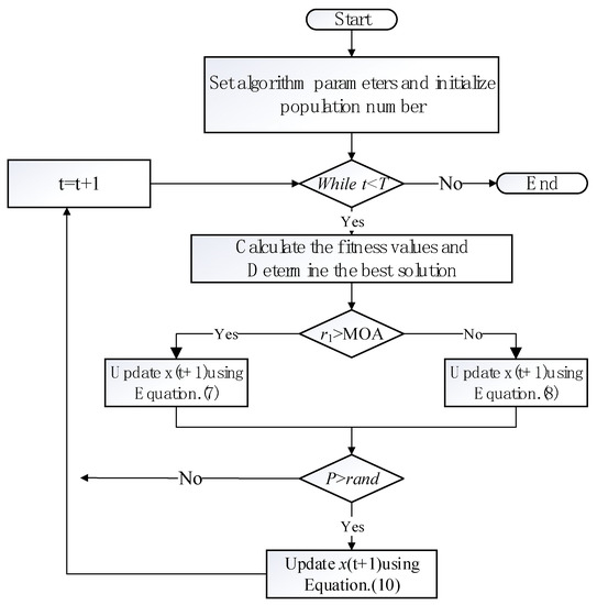 | 1.Set population size N, the maximum number of iterations T. 2.Set up the initial parameters t = 0, α, μ. 3.Initialize the positions of the individuals xi (i = 1, 2, …, N). 4.While (t < T) 5. Update the MOA using Equation (1) and the MOP using Equation (3). 6. Calculate the fitness values and Determine the best solution. 7. For i = 1, 2, …, N do 8. For j = 1, 2, …, Dim 9. Generate the random values between [0, 1] (r1, r2, r3). 10. If r1 > MOA 11. Update the position of x(t + 1) using Equation (2). 12. Else 13. Update the position of x(t + 1) using Equation (5) 14. End if 15. End for 16. End for 17. t = t + 1. 18.End while 19.Return the best solution (x) |