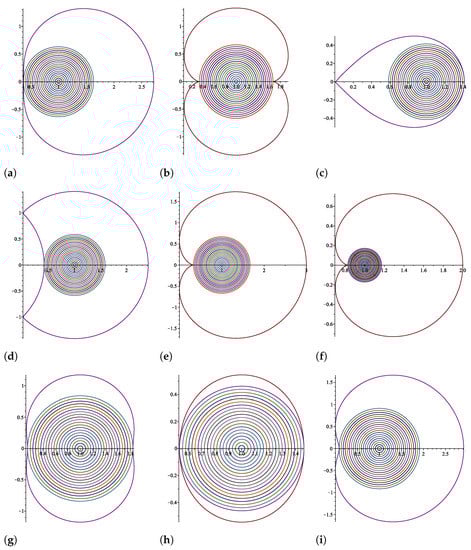 Figures for the Theorem 1. (a) Boundary curve of and for . (b) Boundary curve of and for . (c) Boundary curve of and for . (d) Boundary curve of and for . (e) Boundary curve of and for . (f) Boundary curve of and for . (g) Boundary curve of and for . (h) Boundary curve of and for . (i) Boundary curve of and for .