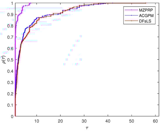 In addition, we use the performance profile proposed by Dolan and Moré in [40] to obtain Figure 4, Figure 5 and Figure 6, which is a standard tool for comparing iterative methods. Figure 4 shows the number of iterations for the performance profile of the MZPRP, the ACPGM, and the DFsLS methods. Figure 5 presents the performance profile based on the number of function evaluations; the CPU time performance profile is reported in Figure 6. From Figure 4, Figure 5 and Figure 6, we can see that the proposed MZPRP method produces better results than ACPGM and DFsLS with a higher percentage in ITER, FVAL and TIME.