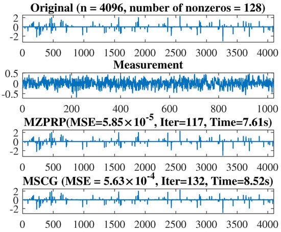In what follows, we give the description of the signal recovery experiment. We consider the reconstruction of a sparse signal of size from observations. The original signal contains randomly non-zero elements with the measurement vector v being distributed with some noise, where Q is a randomly generated Gaussian matrix and is the Gaussian noise distributed normally with mean 0 and variance The signal recovery experiment was performed using MATLAB R2019b installed on a PC with an Intel Core(TM) i5-8250u processor with 4 GB of RAM and CPU 1.60 GHZ.