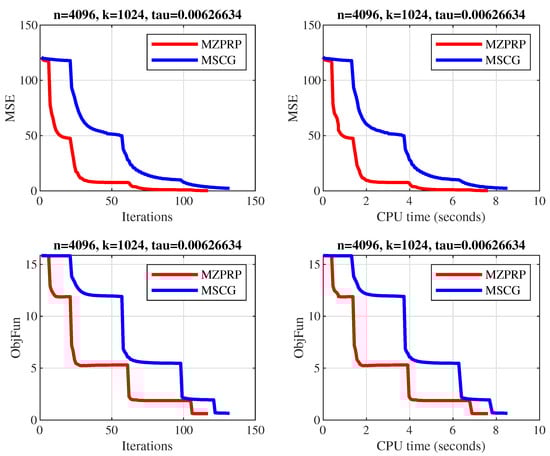 Comparison result of the MZPRP and MSCG methods. The x-axis represents the number of iterations (top left and bottom left), and the CPU time in seconds (top right and bottom right). The y-axis represents the MSE (top left and top right) and the objective function values (bottom left and bottom right).