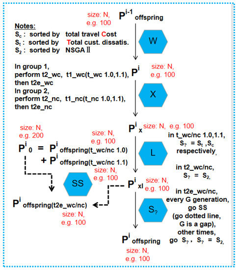 In the overview in Figure 2, W-X-L deploys a special operator (W) to choose parents, a crossover (X) operator and a local search (L) operator. It is worth mentioning that the family of tasks above shares the same initial (I) population (random) for a fair comparison. Selection (S) differs. In S, we use NSGA II, some sorting methods by total customer dissatisfaction or total travel cost, etc. Therefore, so many shared parts above from both the problem and algorithm sides are elaborately constituted toward a harmonious and well-defined test bed of SMO. More of the test bed can be seen in the next 4 figures (Figure 3, Figure 4, Figure 5 and Figure 6), and 3 details (WC, XL, SS).