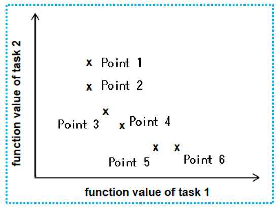 Multi-objective optimization (MOO) and MTO chose different selection pressure. For MOO, points 2, 3, 4, and 5 are better than 1, and 6. However, points 1, 2, 5, and 6 are more preferable than 3 and 4 in the MTO case.
