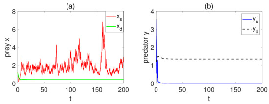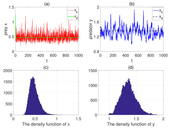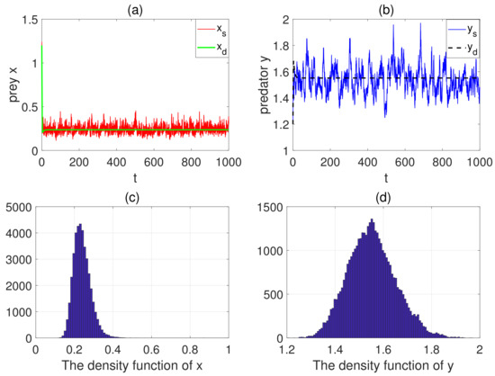 In this case, we analyze the impacts of environmental disturbances on the prey and predator populations. Taking the parameter values in Table 2. Choosing We can obtain , and which satisfy the conditions of Theorems 4 and 5, respectively. This indicates the prey and predator populations are persistent (see Figure 1a,b). That is to say, when the white noise is small, it has less effect on the populations at this time. Furthermore, we see that model exists as a unique stationary distribution (see Figure 1c,d). Keeping the other parameters fixed, let . Notice that holds, which fulfills the condition of Theorem. We find the prey population is persistent (see Figure 2a) and the predator population is extinct (see Figure 2b). This shows the impact of white noise on is significant. That is, only the prey population is persistent.