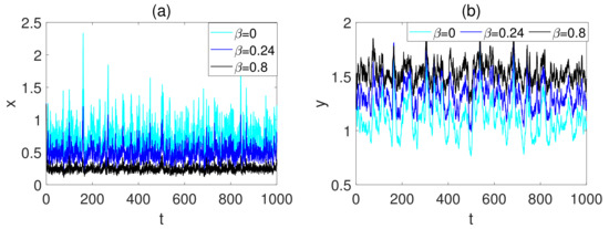 In a word, we find that the predation rate is a saturated functional response when . However, this paper mainly studies the case that . Figure 4 shows the obvious influence of the predation cooperation coefficient on the model. In addition, according to Lemma 5, Theorem 4 and the construction of V function in proving Theorem 5, we can see the important influence of nonlinear disturbance on the model. Moreover, we overcome the difficulties in the construction of V function and the process of inequality expansion and contraction. The above description improves on previous studies.
