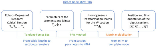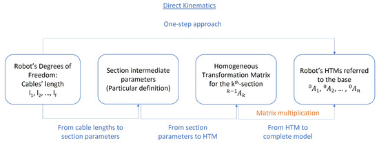 Direct kinematics in CDHR robots tries to find the relationship between the existing degrees of freedom (cables’ length) with the complete robot state at each moment. Let be the states of each of the sections for a CDHR, represented as vectors of parameters. Due to hyper-redundancy, finding a direct solution in one step (from to ) is a very complex task. Often, either simplification hypotheses must be assumed or numerical methods are applied [8]. Therefore, in most cases, the simplification hypotheses allow dividing the model into several steps.