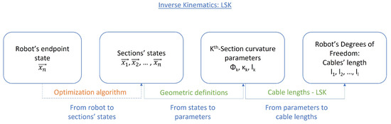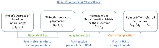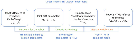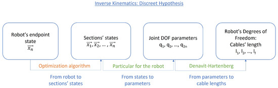 The further steps depend on the chosen model for each particular robot. They are detailed for each hypothesis but include a transformation from the section’s state (usually the endpoint’s pose is enough, as stated in Section 2.1), to certain intermediate parameters. By using them, the cable lengths are found.
