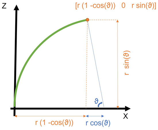 The arch contained in the plane has a radius that can be obtained from its curvature (), and the total angle it rotates around the positive axis y (see in Figure 9) would be defined as in Equation (6).