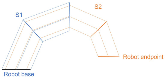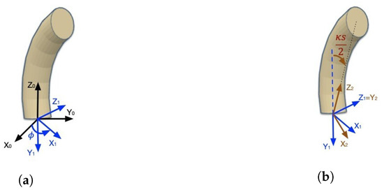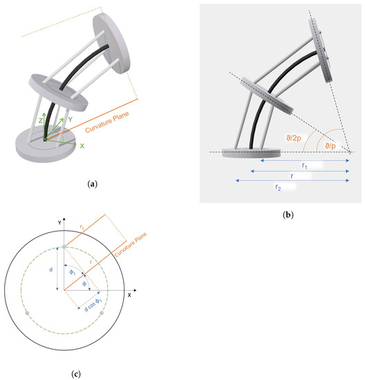 In Figure 7, the application of the PCC hypothesis to the theoretical framework previously established for direct kinematics is presented. The first determination that can be made is the parameters for the hypothesis. When accepting the constant curvature hypothesis, each of the robot’s sections can be modelled through three values: curvature , azimuthal angle and the arc length l.