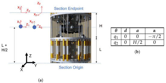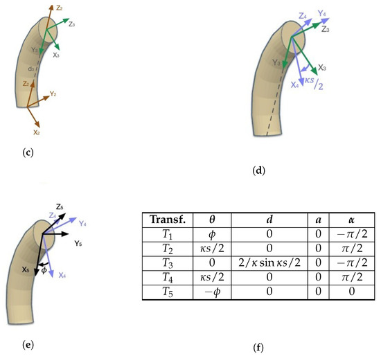 Application of Denavit–Hartenberg’s method to a robotic section of constant curvature. (a) . (b) . (c) . (d) . (e) . (f) Section’s parameter for Denavit–Hartenberg’s method.