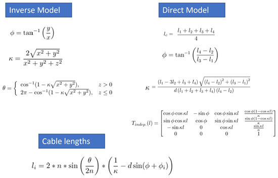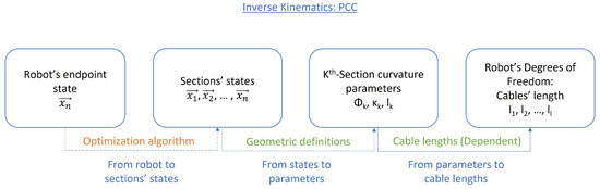 In this work, we use a three degrees of freedom standard as the input of the inverse kinematics. Many morphologies use three independent cables, and those who use four cables usually involve redundancies between them, effectively reducing this number. For simplicity, the three Cartesian coordinates are used (), but orientation parameters could also be considered. Geometric relationships could then be applied to transform the equations between these two cases. In robots with fewer degrees of freedom per section, further restrictions have to be applied, as addressed in Section 7.