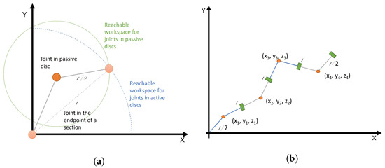 Using these basic concepts, the kinematic problem can be mathematically presented as a transformation between reference systems. One global reference frame can be defined at the centre of the robot’s first disc, with its z axis perpendicular to it and pointing towards the next disc. Afterwards, a reference frame can be defined for each active disc, as well as for the endpoint of the robot. As sections are delimited by active discs, these reference frames represent the beginning and the end of a certain section.