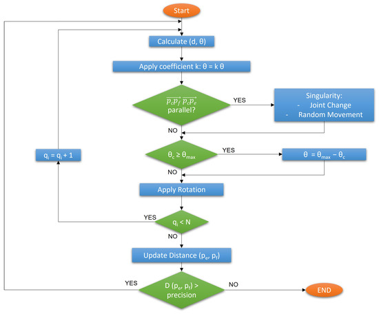 In general, this step uses algorithms that work independently of the robot’s configuration definition (how the generalised coordinates are defined), since they model sections as reference systems and do not need specific information. Since the problem has infinite solutions, these algorithms typically try to optimise a certain value iteratively to obtain one solution. One example of such algorithms is the CCD algorithm or its improved version, the Natural-CCD [26], which is described further on. If the robot configuration is already given for a certain problem, this first step can be omitted.