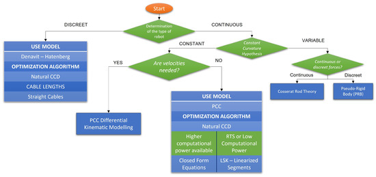 To do so, a simple classification of hyper-redundant robots is adopted as one of the main criteria for choosing a certain method. Afterwards, some generalities on cable-driven hyper-redundant modelling are described. Then, these generalities are analysed on certain algorithms: Denavit–Hartenberg, the PCC (Piecewise Constant Curvature) method or the LSK (Linearised Segment Kinematics) equations. Additionally, and for completeness, a possible algorithm for solving the inverse kinematics is also explained: the Natural-CCD algorithm. Finally, the proposal of the flow diagram is explained and validated.