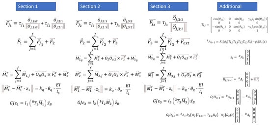 As said, the PRB method can be applied to this case. It is a three-disc robot, so three sections for the PRB need to be considered. Equations can be found in Figure 27. In addition to these equations, some general expressions must be added in order to transform some variables into known information (external forces and the tension of the cables).
