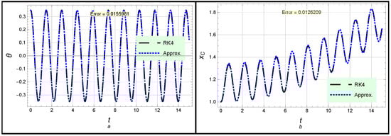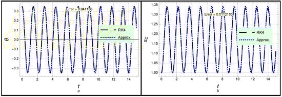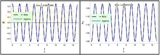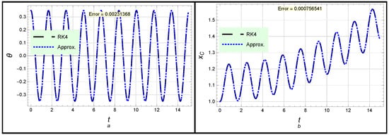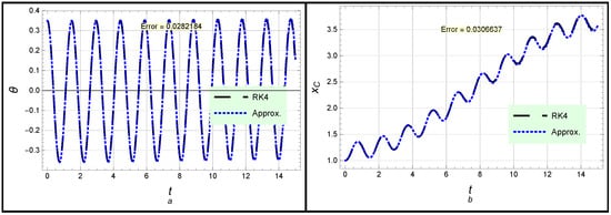 Both solutions (26) and (27) are presented in Figure 2. In Figure 2a, the angle profile according to solution (26) is considered, while the profile of position x is introduced in Figure 2b. Moreover, the forced case is introduced in Figure 3, in which the angle profile according to solution (30) is considered, while the profile of position x given in (31) is displayed. One can see from Figure 2 and Figure 3 as well as the global maximum error given in Table 1 that there is complete congruence between the analytical and numerical approximations, which confirms the high accuracy and effectiveness of the obtained approximations.