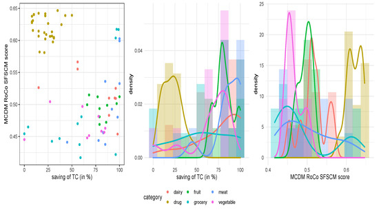 A novel RoCo MCDM model is proposed to obtain a score of the supply chain success factors, such as a group purchasing organization, economies of scale, and the existence of supply data management technology, which are synchronized and integrated with the purchase system. The structure of the proposed model considers non-linear SP, solved by a differential evolution algorithm—specifically with a genetic algorithm [49], and a multilevel setting between savings obtained for pharmacies/FNS products and success factor scores according to the products studied. To deal with the endogeneity bias of the relationships proposed, internal instrumental variables are used by a GMSM method. We believe that the results to be obtained will directly benefit the function of supply chain managers. We conjecture it since a method to obtain a robust indicator will be able to measure success factors for the supply chains they manage. Moreover, our results will allow the managers to understand how these factors influence the organization and product categories on the inventory cost savings. Therefore, the novelty of our proposal is in defining a score that permits us to measure the mentioned success factors in a simple way, in meeting together all three elements (RoCo multi-criteria, non-linear programming, and time-dependent demand) to state a new model, and in applying it to pharmacies and FNS. In summary, the objective of the present investigation is to formulate a novel stochastic inventory model that minimizes the inventories TC in pharmacies and FNS industries. We compare these TC with true TC to establish savings and relate them to supply chain success factors in such industries.