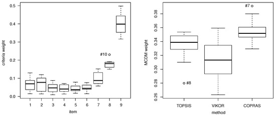 We use distinct pieces of information or items to evaluate the SFSCM performance, the minimum covariance in establishing MCDM weights, and the relative importance order of each item criterion for a successful factor performance. Thus, we assure that any unconsidered epistemic uncertainty would not impact the performance of estimates computed under the key concept of a compromise solution among such distinct methods and their underlying assumptions. With respect to alternative ranking, we utilize: (i) the COPRAS method for stating utility functions [51]; (ii) the TOPSIS method for considering ideal solutions from a matrix formed of m alternatives (5 levels of Likert scale) and criterion, with the highest score being “+” [52]; and (iii) the VIKOR method for considering trade-off between consensus and regret functions [53]. As criteria weighting, we employ: (iv) the SWARA method for considering the relative efficiency of each criterion [54]; and (v) the AHP method for running a pairwise comparison between criteria [55].
